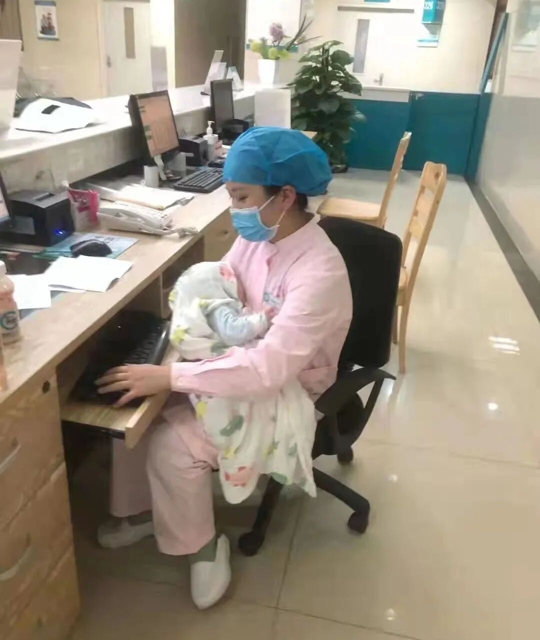 張映玲護(hù)士雖然還是個(gè)未婚的小姑娘,但是抱起孩子來(lái)絲毫不馬虎。她一手抱著孩子,一手快速地敲著電腦,真是工作帶娃兩不誤。小寶貝像是感受到了她的善良和愛(ài)心,不一會(huì)兒就安心地睡著了。
