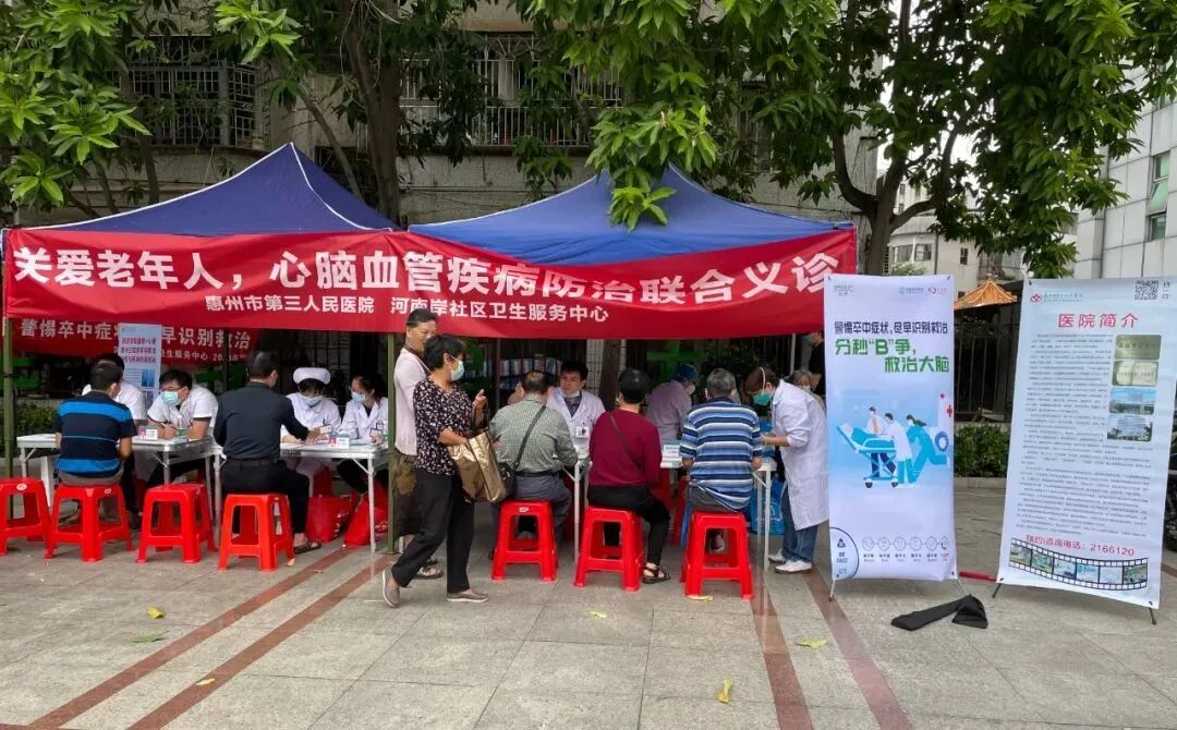 此次義診由惠州三院神經(jīng)醫(yī)學(xué)中心、心血管醫(yī)學(xué)中心及呼吸與危急癥醫(yī)學(xué)科聯(lián)合出診,主要義診內(nèi)容是中老年人居民的心腦血管疾病防止篩查、慢性阻塞性肺病大型篩查以及相關(guān)疾病知識(shí)的健康宣教。