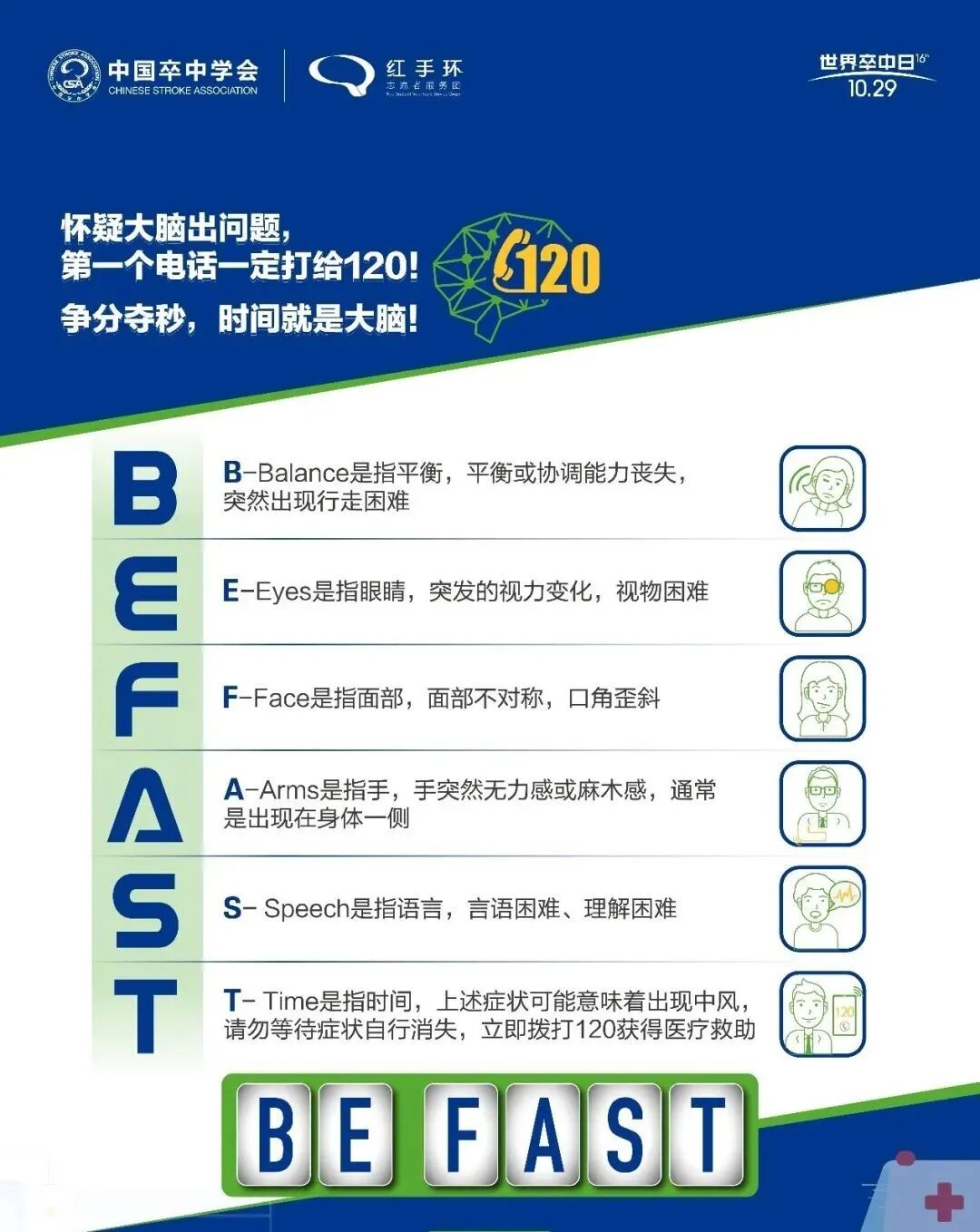 時(shí)間就是大腦,時(shí)間就是生命!2021年7月,中國(guó)卒中學(xué)會(huì)在第七次學(xué)術(shù)年會(huì)期間正式發(fā)布了識(shí)別卒中早期癥狀的“BE FAST口訣”,前5個(gè)字母各代表一個(gè)早期癥狀,最后1個(gè)字母是提醒一旦發(fā)現(xiàn)卒中癥狀,就要馬上撥打急救電話(huà),立刻就醫(yī)!