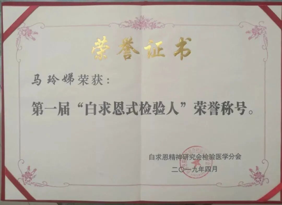 馬玲娣博士榮獲全國首屆“白求恩式檢驗人”