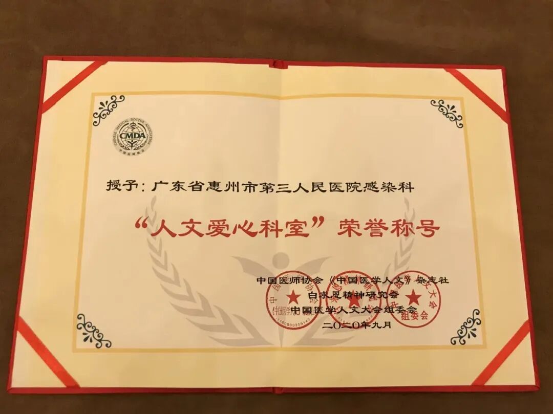 惠州市第三人民醫(yī)院感染科被授予“人文愛心科室”榮譽(yù)稱號;惠州援鄂抗疫英雄徐永輝榮獲全國第四屆“白求恩式好醫(yī)生”,為惠州唯一!