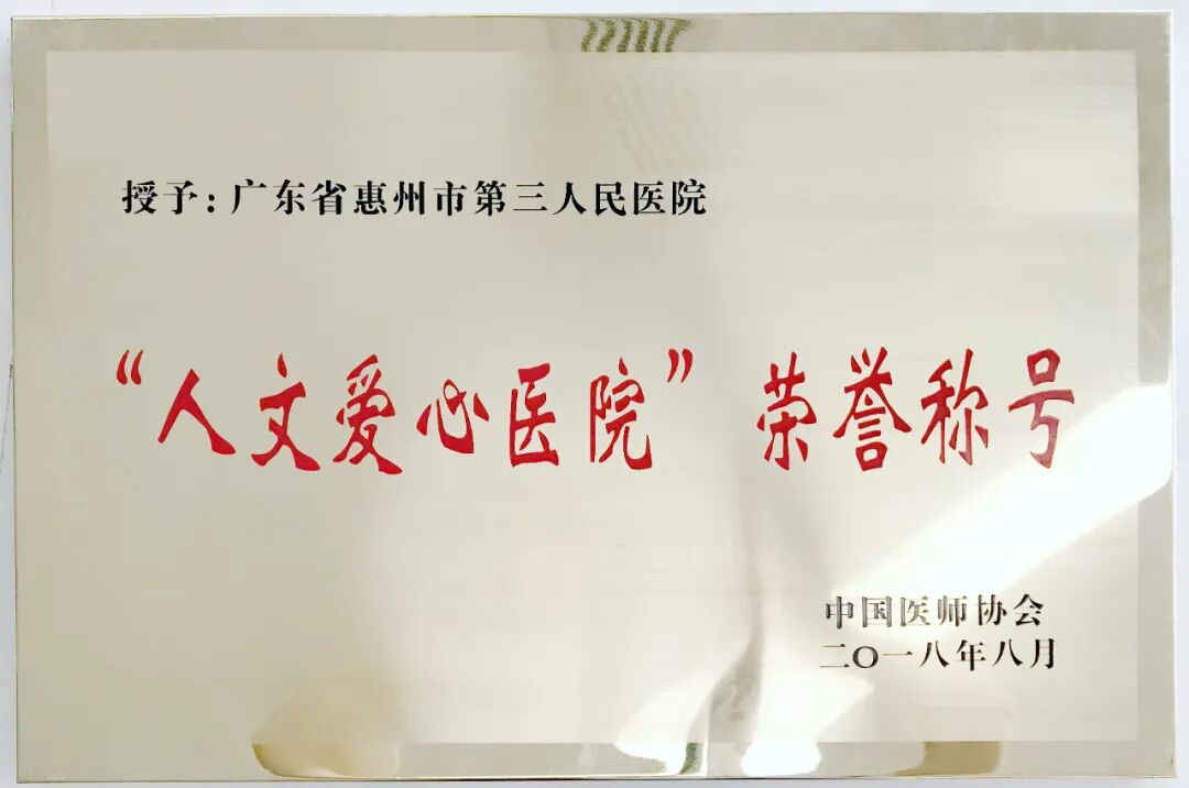 惠州市第三人民醫(yī)院被授予全國“人文愛心醫(yī)院”榮譽(yù)稱號,為惠州首家!武明鑫博士榮獲全國第二屆“白求恩式好醫(yī)生”提名獎!