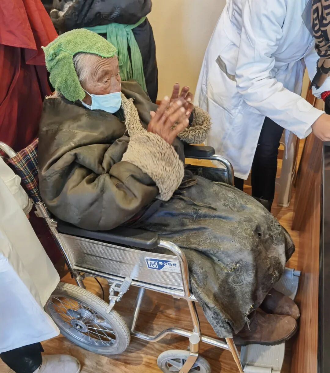 ▲老人雙手合十,對醫(yī)生及志愿者表示感激。