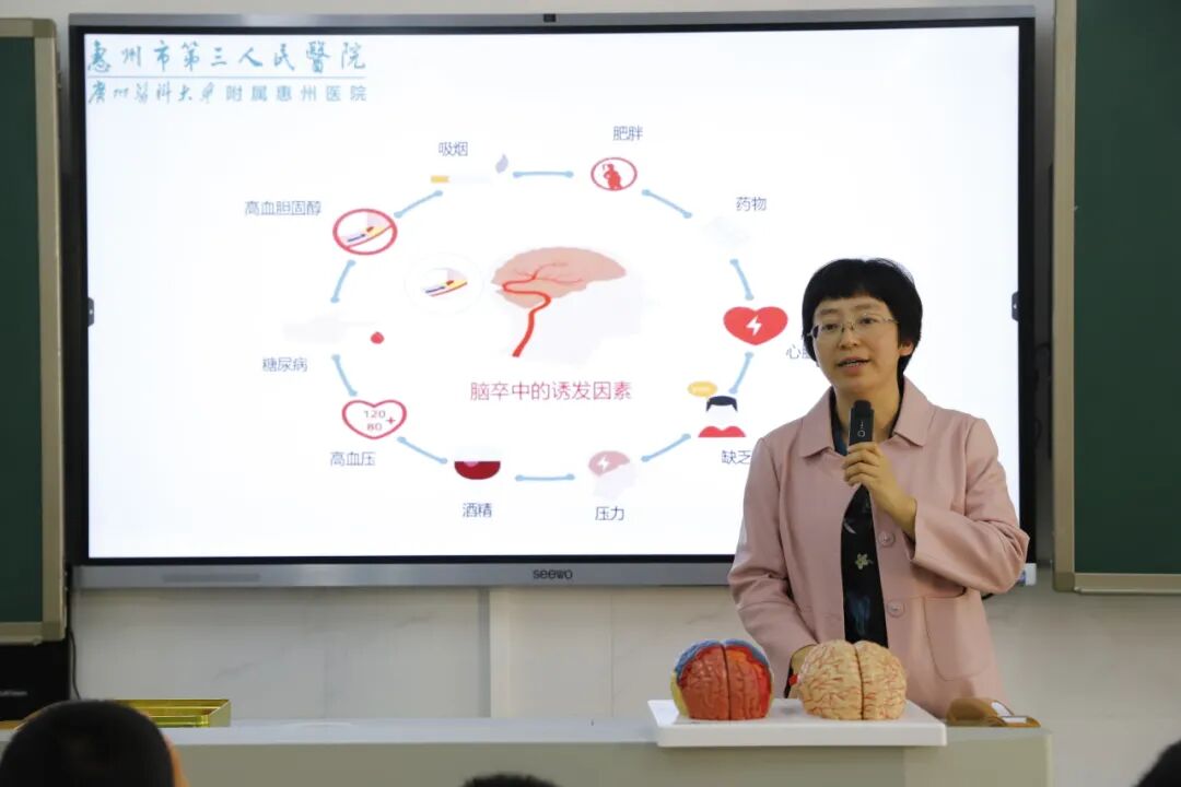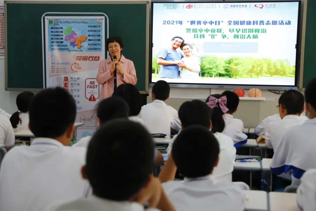 2021年10月25日,惠州三院神經(jīng)醫(yī)學中心神內(nèi)一區(qū)主任顏津津帶隊走進惠州市第一中學初中部,開展了以“拯救”(快速識別及幫助腦卒中患者)為主題的班會活動,為中學生們進行腦卒中公益健康宣教。