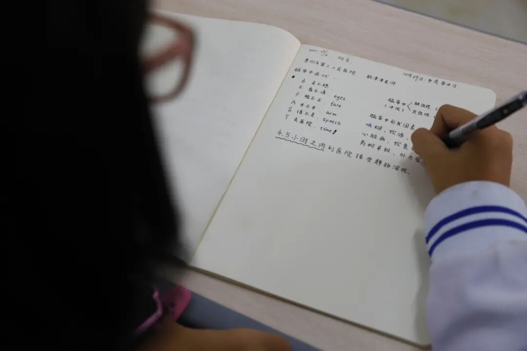 顏津津主任生動地講述以上腦卒中發(fā)病的癥狀,立即指導學生們兩兩演示,將班會推入高潮。