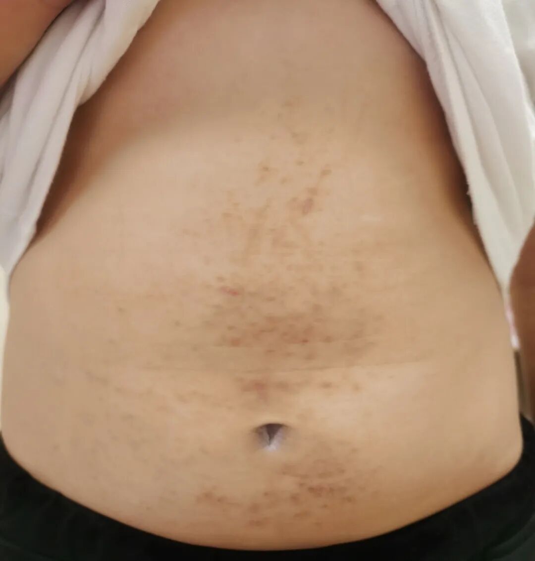 檢查發(fā)現(xiàn),胸背部見(jiàn)明顯抓痕,頸、背部、手肘、腘窩、腳踝見(jiàn)多處皮膚增厚、皮損,部分干燥、脫皮。