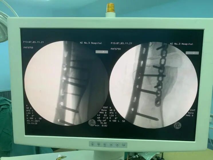 術(shù)中,醫(yī)療團(tuán)隊按照預(yù)定手術(shù)思路,首先沿左大腿中下段外側(cè)縱形作皮膚切口,安裝股骨前方截骨導(dǎo)板,用擺鋸沿截骨導(dǎo)板截斷股骨畸形最大處,預(yù)留股骨干外側(cè)部分皮質(zhì)。然后用撐開器沿截骨端將其撐開并放置內(nèi)側(cè)楔形導(dǎo)板,在C臂機(jī)透視下見經(jīng)截骨矯形后現(xiàn)股骨干向內(nèi)、向后成角畸形基本恢復(fù),力線基本糾正。最后進(jìn)行左側(cè)股骨鋼板內(nèi)固定術(shù)+左側(cè)髂骨切除術(shù)用作移植物+左側(cè)股骨植骨術(shù)+左側(cè)股骨人工骨植骨術(shù)。整個手術(shù)過程非常順利。
