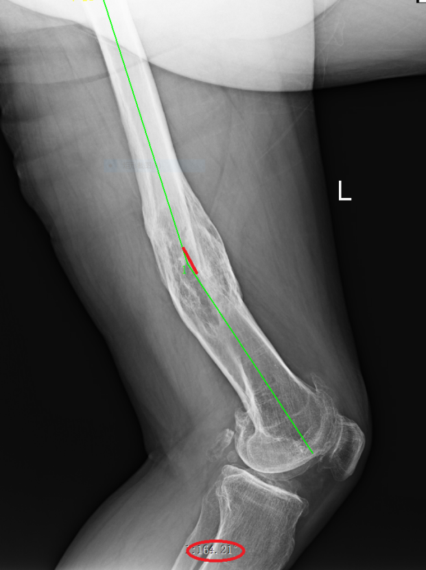 武明鑫教授為其仔細(xì)體格檢查,發(fā)現(xiàn)患者左大腿中下段外側(cè)可見一處12cm陳舊性切口疤痕,膝關(guān)節(jié)內(nèi)翻畸形,大腿中下段向外成角,膝關(guān)節(jié)內(nèi)外側(cè)局部壓痛,內(nèi)側(cè)尤為明顯,未觸及骨擦感及反?;顒?,肌力Ⅳ級,肌張力降低,左下肢較右下肢縮短約5.0厘米。拍X射線片檢查示:1.左股骨中下段骨質(zhì)膨隆并股骨彎曲,考慮是左股骨中下段骨折畸形愈合。2.左側(cè)膝關(guān)節(jié)退行性變。