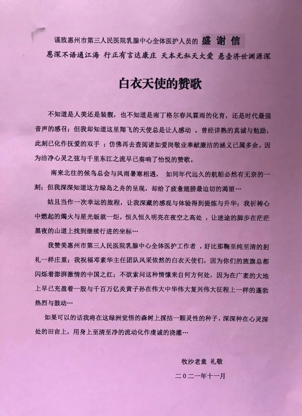 2021年11月的一天,一位和藹可親的大叔捧著一疊粉紅色紙打印的感謝信,真誠地送給乳腺外科每一位醫(yī)護人員,謝謝大家這段時間對他妻子的關(guān)心和照顧。
