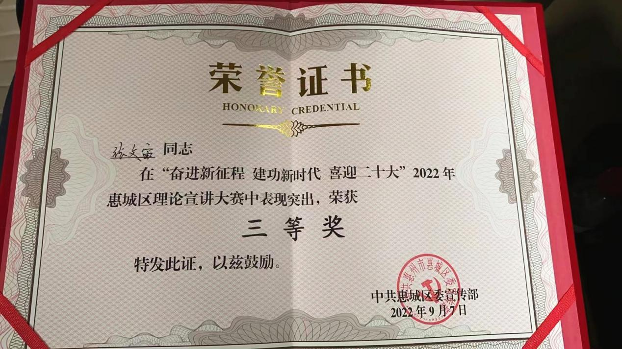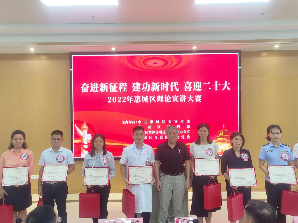 2022年9月7日上午,由惠城區(qū)委宣傳部會(huì)同區(qū)社科聯(lián)、區(qū)互聯(lián)網(wǎng)行業(yè)黨委聯(lián)合在全區(qū)舉辦“奮進(jìn)新征程 建功新時(shí)代 喜迎二十大”2022年惠城區(qū)理論宣講大賽落下帷幕。全區(qū)共17家單位參加比賽,經(jīng)過專家評(píng)審,惠州市第三人民醫(yī)院參賽的張文宙醫(yī)生宣講的《千里架起連心橋 合力共筑健康夢(mèng)》最終在比賽中榮獲三等獎(jiǎng)。