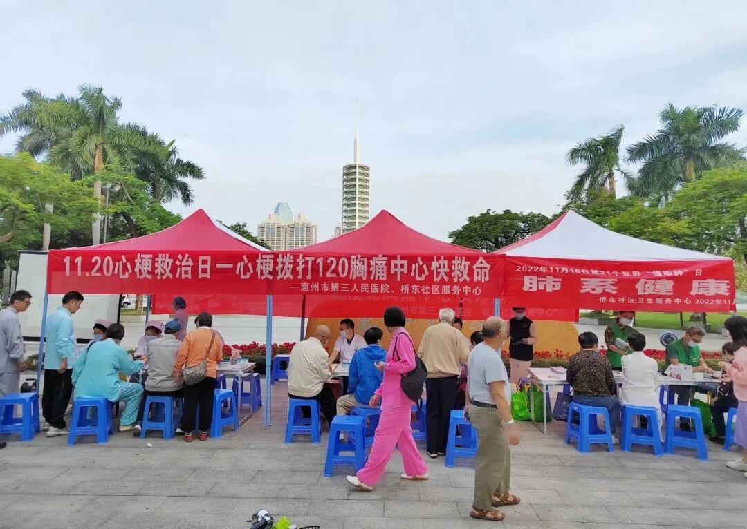 2022年11月20日是第7個(gè)全國(guó)“心梗救治日”,此次宣傳主題為“心梗撥打120,胸痛中心快救命”。為進(jìn)一步提高公眾對(duì)心梗疾病的認(rèn)識(shí),普及急性心梗的規(guī)范化救治流程,當(dāng)日上午,惠州市第三人民醫(yī)院與橋東社區(qū)衛(wèi)生服務(wù)中心聯(lián)合在東江沙公園廣場(chǎng)開(kāi)展了主題義診與健康宣傳活動(dòng)。