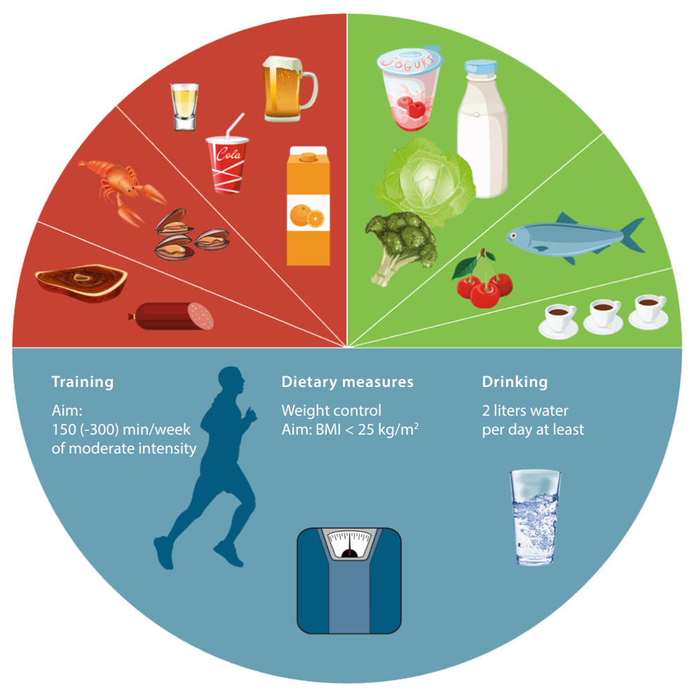 體重方面,建議控制在正常范圍內(nèi),即BMI (體重/身高2)介于18.5-23.9 kg/m2。運動方面建議每周至少進(jìn)行150分鐘中等強度的有氧運動,但要避免劇烈運動誘發(fā)痛風(fēng)發(fā)作。
