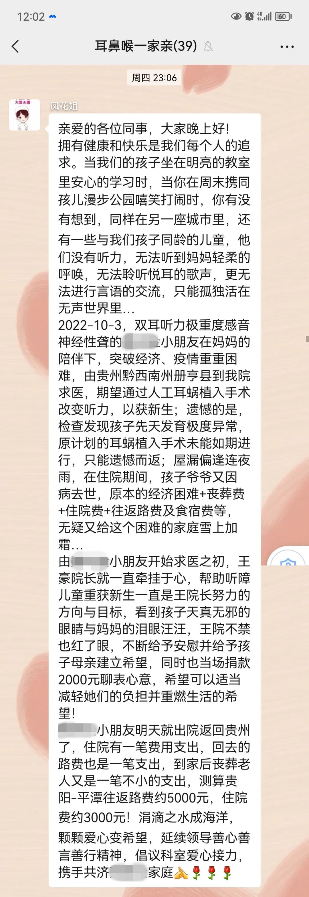 在王豪副書記囑托下,李鳳花護(hù)士長(zhǎng)深夜在科室群里倡議大家進(jìn)行愛心募款,并迅速向醫(yī)院黨委辦以及工會(huì)反映情況,號(hào)召大家伸出援手,集全院力量籌集善款,向奇奇一家傳遞一份溫暖,得到了全院各科黨員干部和職工的踴躍參與和積極響應(yīng)。迄今為止,全院各科黨員干部和職工共同為奇奇家捐款超過(guò)30000元。其中,耳鼻喉科全體醫(yī)護(hù)人員在捐贈(zèng)了6400元后,李鳳花護(hù)士長(zhǎng)還積極聯(lián)系醫(yī)院工會(huì)通過(guò)旭日基金為患者減免了住院費(fèi)2600余元。