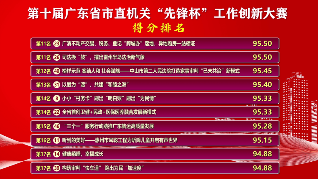 2022年的12月16日,第十屆廣東省市直機(jī)關(guān)“先鋒杯”工作創(chuàng)新大賽(決賽)在廣州隆重舉行,惠州市直機(jī)關(guān)工委選送作品中有5個(gè)作品成功晉級(jí)參加決賽。