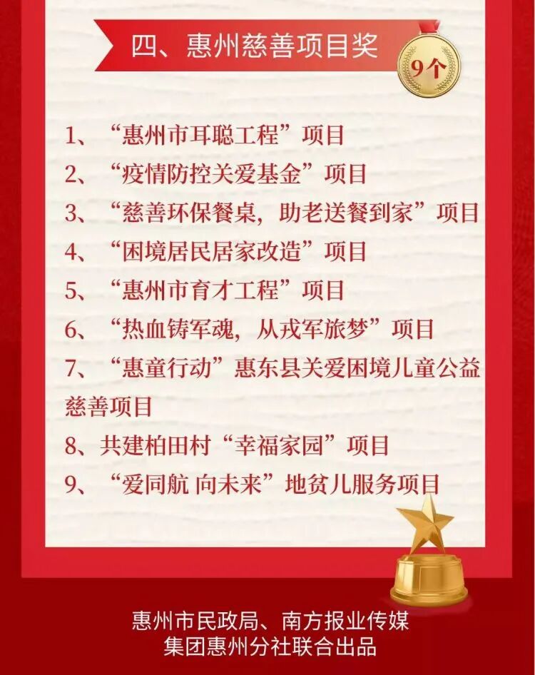 此次表彰大會上,“惠州市耳聰工程”項(xiàng)目等9個項(xiàng)目獲得“惠州慈善項(xiàng)目獎”,25個單位獲得“惠州慈善貢獻(xiàn)獎”,2個單位獲得“惠州慈善突出貢獻(xiàn)獎”,5個單位獲得“惠州慈善楷模獎”。