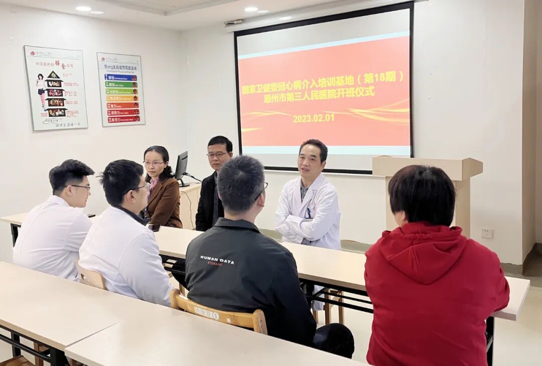 2023年2月1日,國家衛(wèi)生健康委醫(yī)院管理所項目培訓——惠州市第三人民醫(yī)院冠心病介入培訓基地開班儀式在惠州市第三人民醫(yī)院順利舉行。培訓基地主任肖純教授、基地副主任鐘思干教授、科教部主任簡希堯、教學科主任孔元蓉以及新一期培訓學員參加了此次開班儀式。
