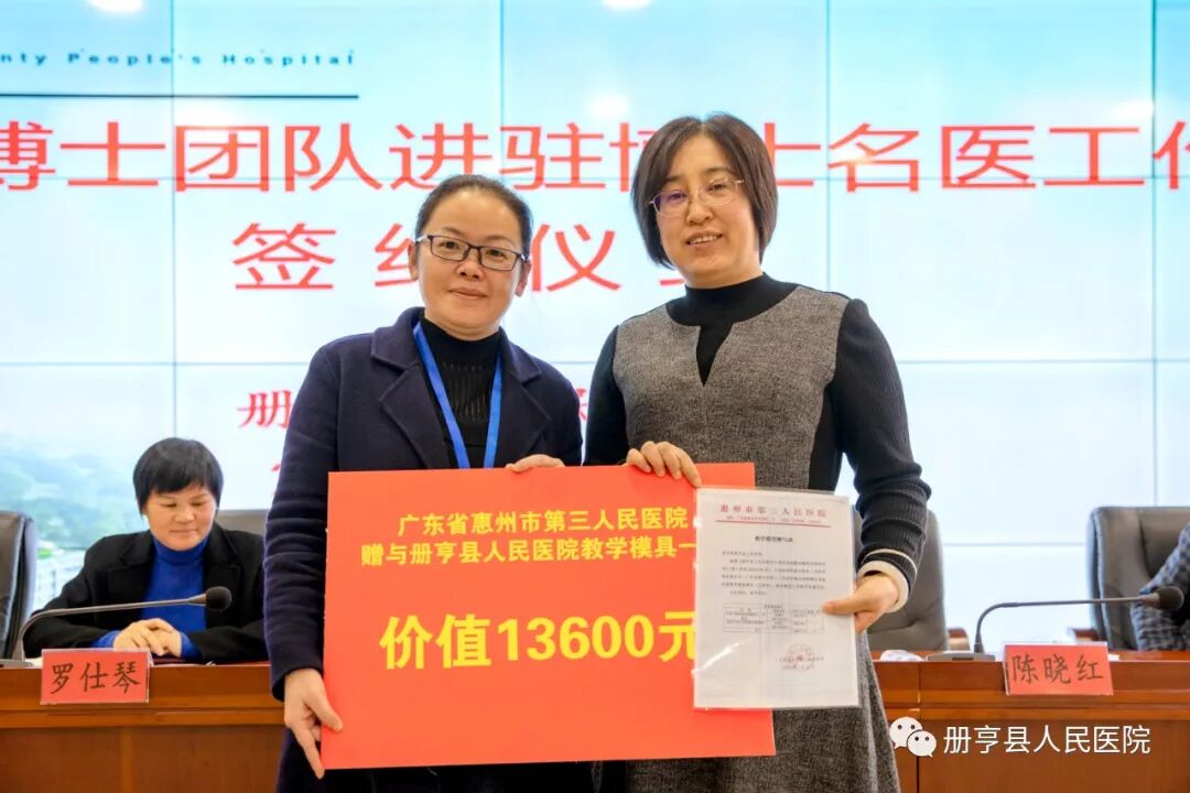 儀式上,依次進(jìn)行了惠州市第三人民醫(yī)院博士名醫(yī)工作站授牌、冊(cè)亨縣縣域內(nèi)醫(yī)學(xué)影像質(zhì)控中心授牌、李雪松博士團(tuán)隊(duì)進(jìn)駐博士名醫(yī)工作站簽約、急救技能教學(xué)模型捐贈(zèng)儀式。與會(huì)領(lǐng)導(dǎo)共同為冊(cè)亨縣人民醫(yī)院神經(jīng)醫(yī)學(xué)中心、醫(yī)學(xué)影像中心揭牌。
