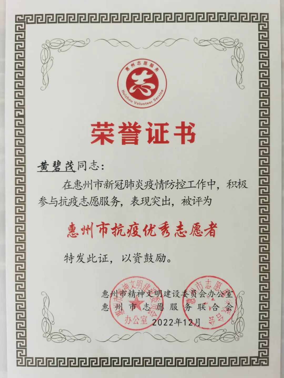 近日,惠州市文明辦、市志愿服務聯(lián)合會在全市開展惠州市“志愿抗疫先進典型”推薦評選活動。其中,惠州市第三人民醫(yī)院白求恩志愿服務隊獲評“惠州市抗疫優(yōu)秀志愿服務組織”,黃碧茂、陳偉花、王玲玲同志獲“惠州市抗疫優(yōu)秀志愿者”榮譽稱號!