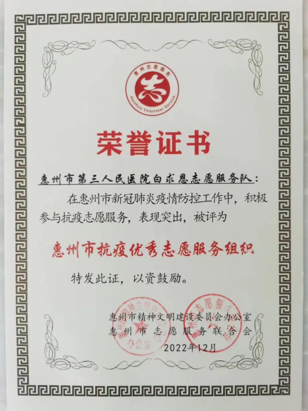 八年來,惠州市第三人民醫(yī)院白求恩志愿服務隊多次榮獲惠州市最佳志愿服務組織,在2020年,率先派出惠州首批次“援鄂”醫(yī)療隊,醫(yī)院獲“惠州市先進集體”、“廣東省抗擊新冠肺炎疫情先進集體”等榮譽稱號,同年被授予“白求恩精神教育基地”;在2021年,被廣東省委宣傳部命名為“第七批廣東省學雷鋒活動示范點”。一直以來,惠州三院的志愿者們用實際行動弘揚“奉獻、友愛、互助、進步”的志愿者精神。