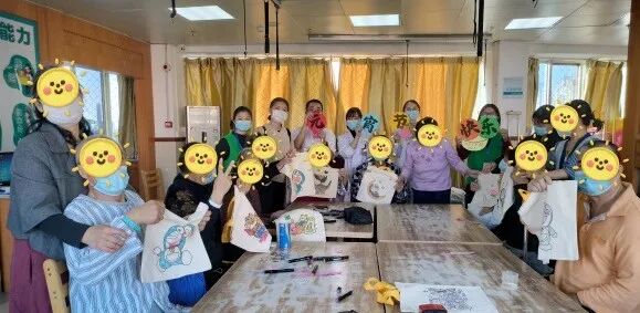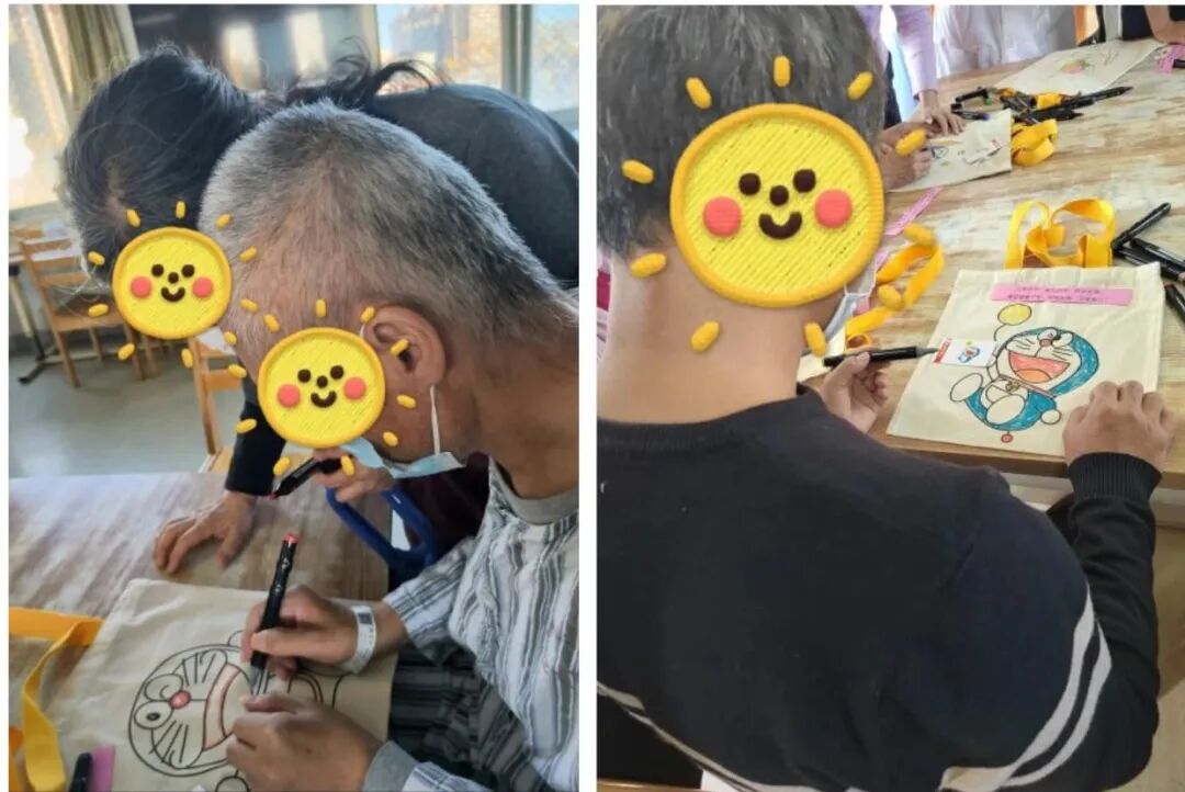 活動(dòng)最后一環(huán)節(jié),醫(yī)務(wù)社工將內(nèi)藏福句的帆布袋發(fā)放到患者手上,“健康常伴”、“早日康復(fù)”、“萬(wàn)事順心”患者們紛紛念出自己抽到的祝福語(yǔ)。帶著接收到的暖流,患者發(fā)揮自主的想象力和動(dòng)手能力,紛紛創(chuàng)作屬于自己的福袋,家屬們也躍躍欲試,握住家人的患側(cè)手一起參與,各種各樣可愛(ài)的圖案躍然眼前。
