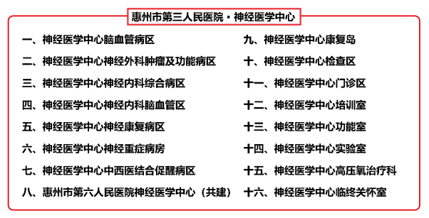 神經(jīng)醫(yī)學(xué)中心包括神經(jīng)醫(yī)學(xué)中心腦血管病區(qū)、神經(jīng)醫(yī)學(xué)中心神經(jīng)外科腫瘤及功能病區(qū)、神經(jīng)醫(yī)學(xué)中心神經(jīng)內(nèi)科綜合病區(qū)、神經(jīng)醫(yī)學(xué)中心神經(jīng)內(nèi)科腦血管區(qū)、神經(jīng)醫(yī)學(xué)中心神經(jīng)康復(fù)病區(qū)、神經(jīng)醫(yī)學(xué)中心神經(jīng)重癥病房、神經(jīng)醫(yī)學(xué)中心中西醫(yī)結(jié)合促醒病區(qū)、惠州市第六人民醫(yī)院神經(jīng)醫(yī)學(xué)中心(共建)、神經(jīng)醫(yī)學(xué)中心康復(fù)島,神經(jīng)醫(yī)學(xué)中心檢查區(qū)、神經(jīng)醫(yī)學(xué)中心門診區(qū)、神經(jīng)醫(yī)學(xué)中心培訓(xùn)室、神經(jīng)醫(yī)學(xué)中心功能室、神經(jīng)醫(yī)學(xué)中心實(shí)驗(yàn)室、神經(jīng)醫(yī)學(xué)中心高壓氧治療科、神經(jīng)醫(yī)學(xué)中心臨終關(guān)懷室共16個單元?;颊呖梢栽谥行耐瓿?/span>從疾病預(yù)防、診斷、治療、康復(fù)、心理關(guān)懷、健康教育到長期隨訪等“一站式”全程診療服務(wù)。