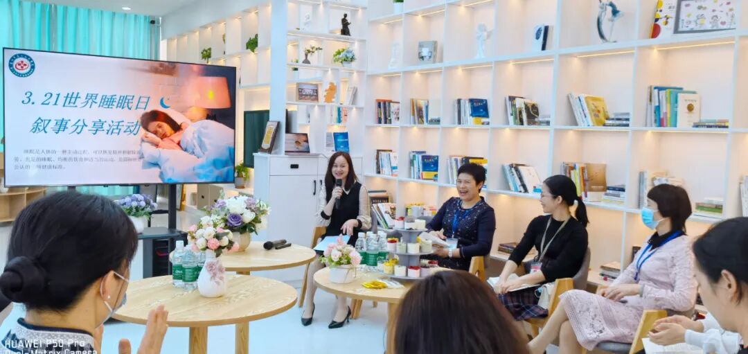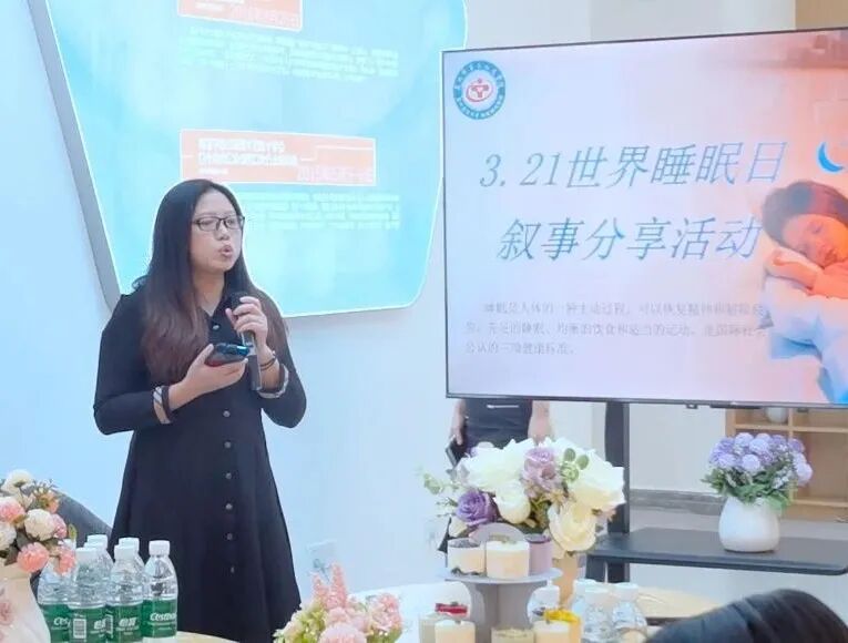 在觀看完一段睡眠小知識的視頻后,惠州市第三人民醫(yī)院護(hù)理部主任李林枝首先作分享。她從世界睡眠日背景、針對失眠者推薦敘事閱讀處方、名人抗失眠偏方以及與睡眠相關(guān)的名言等內(nèi)容展開分享。