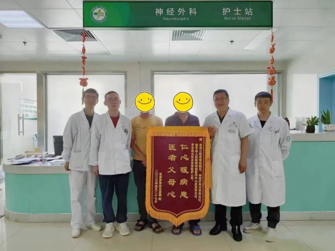 2023年4月28日,羅叔順利出院了!在貴州省黔西南州冊亨縣人民醫(yī)院神經(jīng)外科,羅叔的兩個(gè)兒子高興地送來一面錦旗,上面寫著“仁心暖病患 醫(yī)者父母心”,“贈(zèng):惠州市第三人民醫(yī)院李雪松院長……”!