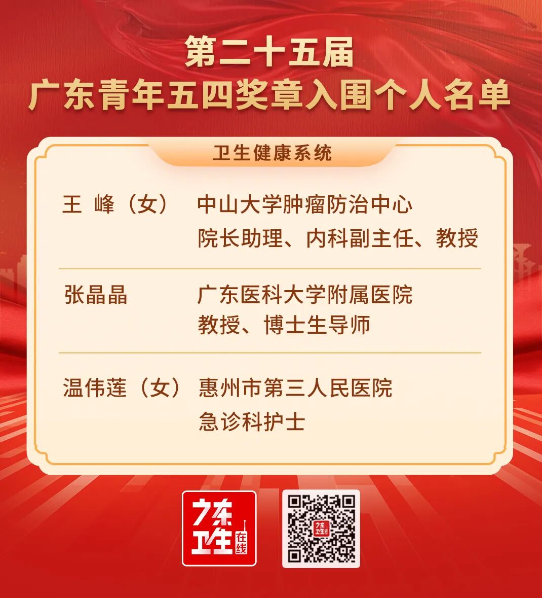 2023年5月4日,共青團(tuán)廣東省委員會(huì)、廣東省青年聯(lián)合會(huì)公示第二十五屆廣東青年五四獎(jiǎng)?wù)聜€(gè)人(集體)入圍名單,共有40名個(gè)人、40個(gè)集體。其中,惠州市第三人民醫(yī)院急診醫(yī)學(xué)部急診科護(hù)士溫偉蓮入圍該名單。