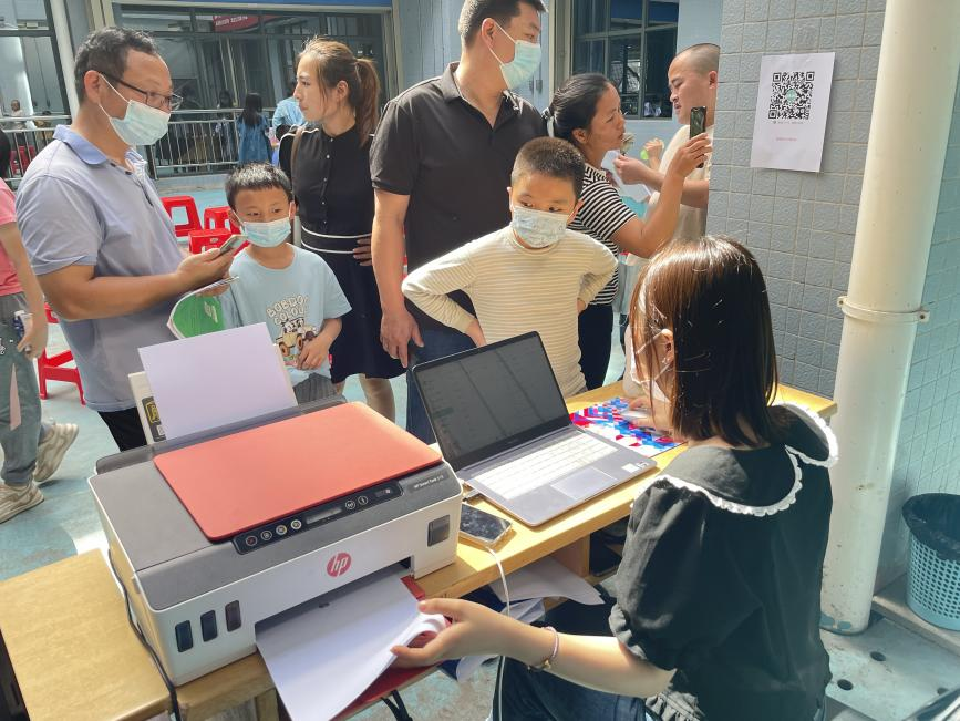 志愿者打印生長(zhǎng)發(fā)育資料給孩子
