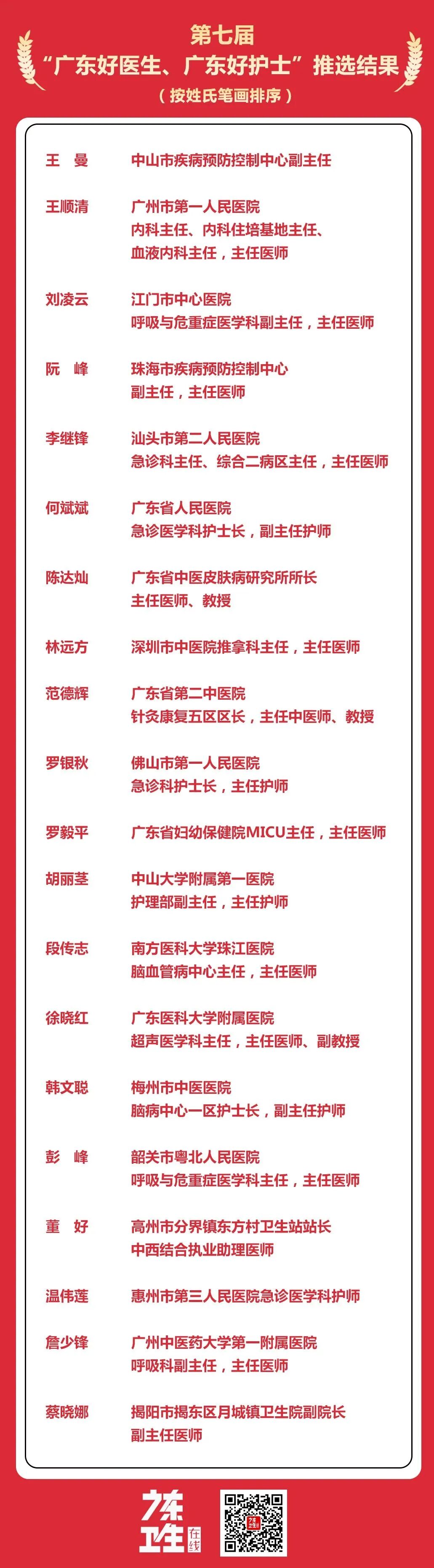 2023年5月11日,廣東省衛(wèi)生健康委、省文明辦、省中醫(yī)藥局聯(lián)合發(fā)布了“廣東好醫(yī)生、廣東好護(hù)士”名單!經(jīng)過嚴(yán)格規(guī)范的評(píng)選程序,評(píng)出"廣東好醫(yī)生、廣東好護(hù)士"獲獎(jiǎng)?wù)?/span>20名。