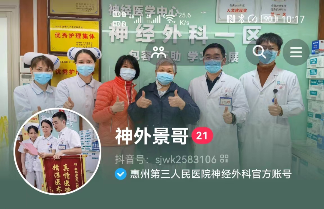 其中,惠州三院神經(jīng)醫(yī)學中心目前已開通并運營4個短視頻賬號,包括專家賬號“神經(jīng)內(nèi)科醫(yī)生黃志勇”、“景哥講腦血管”、“神經(jīng)外科醫(yī)生魏小兵”以及科室賬號“神外景哥”。這些健康科普內(nèi)容涉及疾病預防科普、醫(yī)護日常、病例個案、人文故事等多個方面,受到了廣大用戶的關注和好評。截至目前,累計制作并上傳了800多個科普視頻,累計獲近億人次觀看。