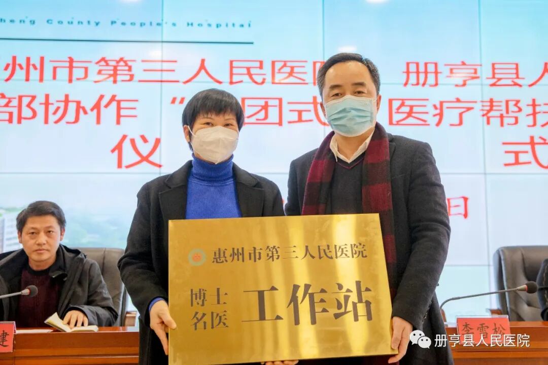 惠城區(qū)人大常委會副主任、惠州市第三人民醫(yī)院院長李雪松(右一)前往冊亨縣人民醫(yī)院調(diào)研指導(dǎo)工作,并舉行博士名醫(yī)工作站授牌儀式