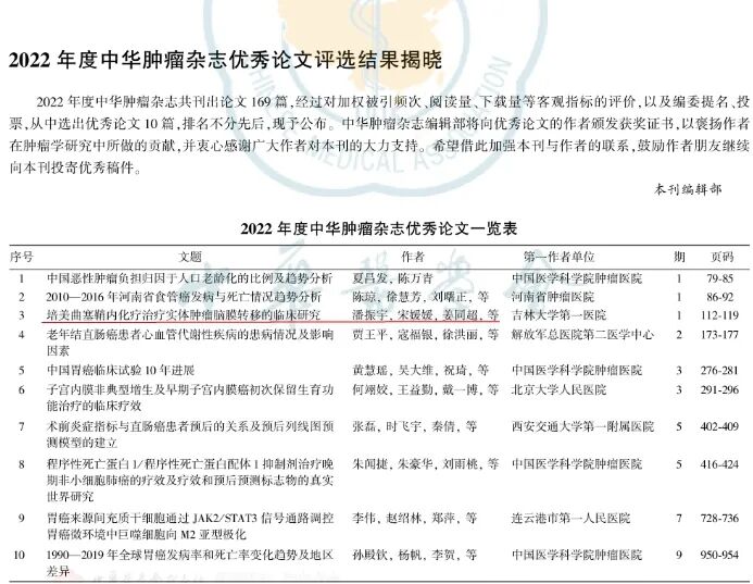 《中華腫瘤雜志》創(chuàng)刊于1979年,是中華醫(yī)學(xué)會(huì)主辦、中國(guó)醫(yī)學(xué)科學(xué)院腫瘤醫(yī)院承辦的國(guó)內(nèi)頂級(jí)腫瘤學(xué)專(zhuān)業(yè)期刊。現(xiàn)任主編為國(guó)家癌癥中心主任、中國(guó)醫(yī)學(xué)科學(xué)院腫瘤醫(yī)院院長(zhǎng)赫捷院士,副主編由山東省腫瘤醫(yī)院院長(zhǎng)于金明院士、中山大學(xué)醫(yī)學(xué)院院長(zhǎng)宋爾衛(wèi)院士、國(guó)家新藥臨床研究中心主任徐兵河院士等5位腫瘤學(xué)領(lǐng)域頂級(jí)專(zhuān)家擔(dān)任。期刊定位于國(guó)內(nèi)重大腫瘤學(xué)研究成果,或?qū)<抑改闲晕恼隆?022年度共刊文169篇。經(jīng)過(guò)對(duì)加權(quán)被引頻次、閱讀量、下載量等客觀指標(biāo)的評(píng)價(jià)以及編委提名、投票,評(píng)選優(yōu)秀論文10篇,其中,惠州市第三人民醫(yī)院放療科潘振宇教授團(tuán)隊(duì)論文成功入選。