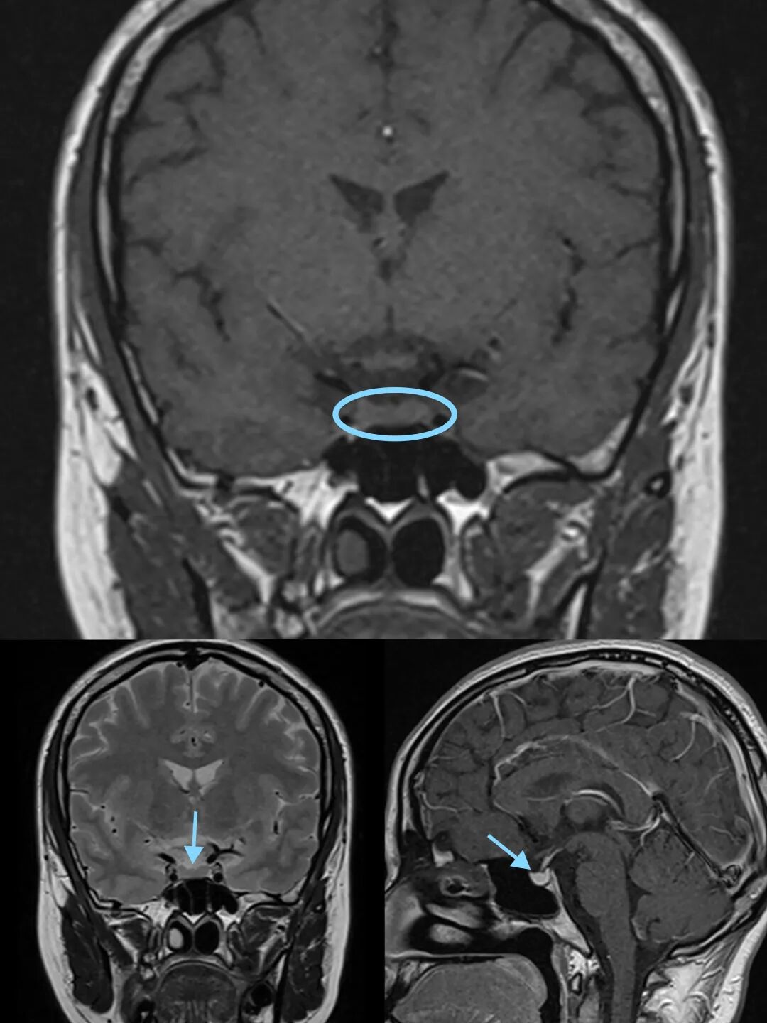 磁共振成像(MRI)是一種無(wú)創(chuàng)性、無(wú)輻射的影像學(xué)檢查設(shè)備,具有軟組織分辨率較高的優(yōu)勢(shì);常規(guī)以垂體為中心對(duì)鞍區(qū)進(jìn)行橫斷位、冠狀位、矢狀位及動(dòng)態(tài)增強(qiáng)掃描得出圖像,可以全方位觀(guān)察垂體的形態(tài)、大小、信號(hào)等表現(xiàn),從而判斷正常或異常。當(dāng)垂體出現(xiàn)異常時(shí),將影響青少年的生長(zhǎng)發(fā)育。
