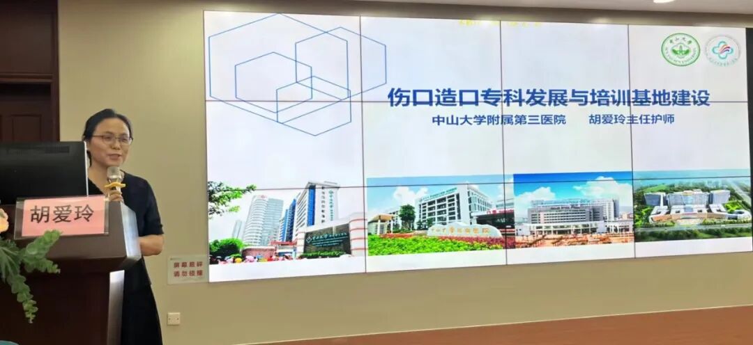 中山大學(xué)附屬第三醫(yī)院護(hù)理教研室副主任胡愛玲為大家分享《傷口造口??瓢l(fā)展與培訓(xùn)基地建設(shè)》,以??谱o(hù)士的核心能力為基礎(chǔ),針對??谱o(hù)士結(jié)合臨床實踐為主的“六位一體”的角色,為區(qū)域內(nèi)如何打造傷口造口??谱髁司实膱蟾?。