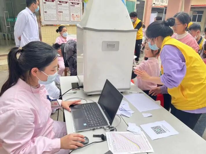 護士給孩子們測量身高體重、繪制曲線圖