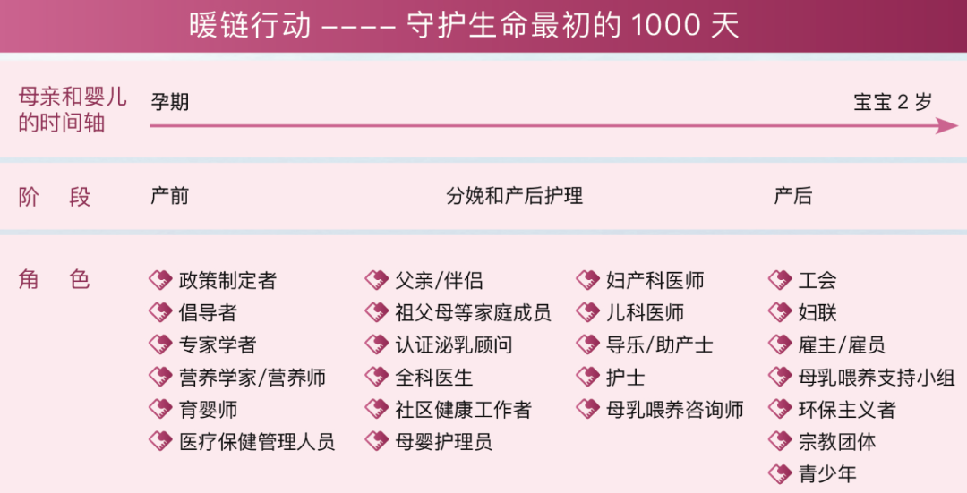 “暖鏈行動(dòng)”是一項(xiàng)保護(hù)、促進(jìn)和支持母乳喂養(yǎng)的全球性行動(dòng),倡導(dǎo)以母親和嬰兒為核心,遵循生命最初1000天的時(shí)間軸,所有支持母乳喂養(yǎng)的醫(yī)務(wù)人員及社會(huì)各界,都是暖鏈中的一環(huán),并通過(guò)各環(huán)節(jié)之間的協(xié)作,傾聽(tīng)母親及寶寶的心聲,為母嬰家庭傳遞一致信息及提供支持措施,以幫助母親和嬰兒獲得持續(xù)的、滿意的、有效的母乳喂養(yǎng)體驗(yàn)。