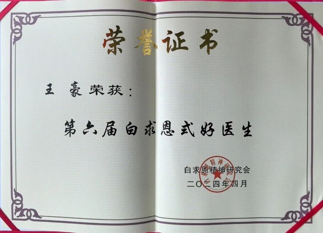 2020年以來(lái),王豪先后獲評(píng)惠州市衛(wèi)健系統(tǒng)“最美黨員”、惠州醫(yī)師獎(jiǎng)、惠州市醫(yī)學(xué)科學(xué)技術(shù)獎(jiǎng)·健康促進(jìn)獎(jiǎng)、中國(guó)醫(yī)院人文品牌峰會(huì)“風(fēng)尚人物”獎(jiǎng)、中國(guó)聾協(xié)“突出貢獻(xiàn)獎(jiǎng)”、在廣東省總工會(huì)“優(yōu)秀追夢(mèng)人”、“惠城區(qū)優(yōu)秀政協(xié)委員”、“惠州市最美志愿者”、“惠州好人”等。2023年榮獲“廣東省五一勞動(dòng)獎(jiǎng)?wù)隆保?024年榮獲中國(guó)“白求恩式好醫(yī)生”。