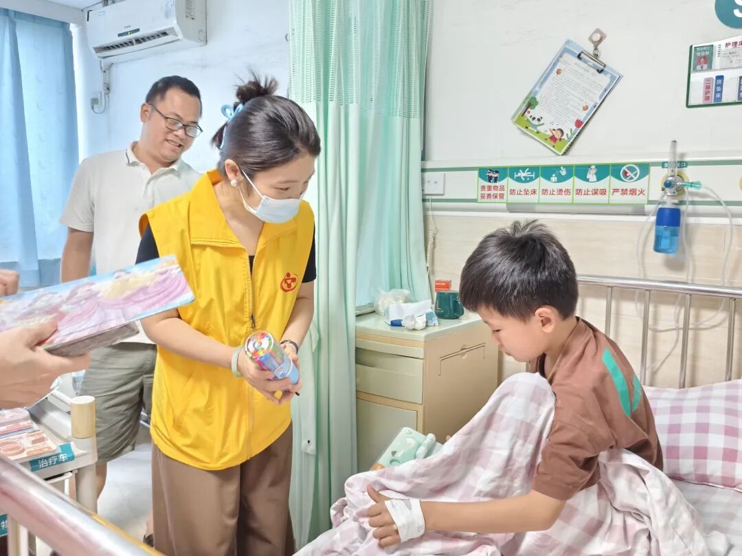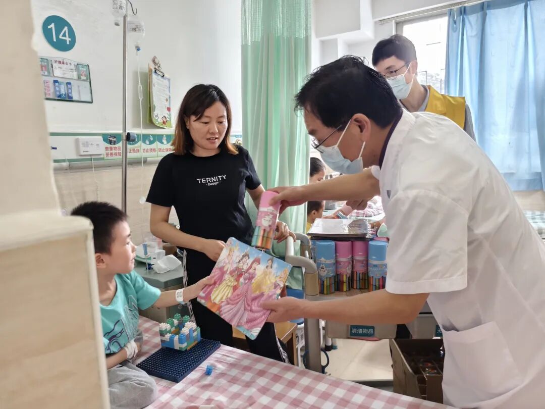 在李林枝和黃海忠兩位黨支部書(shū)記的帶領(lǐng)下,大家推著滿載愛(ài)心禮物的小車(chē)走進(jìn)兒科門(mén)診和病房。每到一處,黨員們都親切詢問(wèn)孩子們的身體狀況,送上誠(chéng)摯的節(jié)日祝福,鼓勵(lì)他們勇敢面對(duì)病痛,早日康復(fù)。小小禮物如同魔法,瞬間點(diǎn)亮了他們因治療而略顯單調(diào)的日子,更讓這份專(zhuān)屬的兒童節(jié)氣息,在兒科的每個(gè)角落悄然綻放。