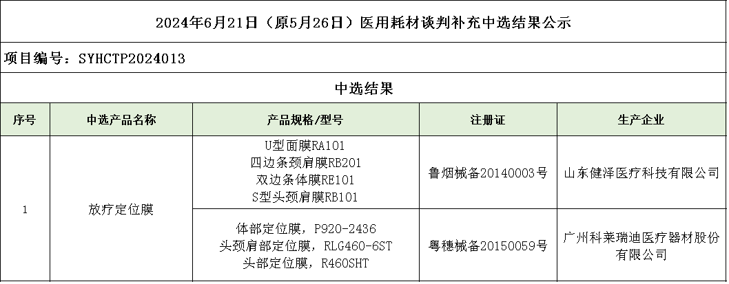 2024年6月21日(原5月26日)醫(yī)用耗材談判補(bǔ)充中選結(jié)果公示