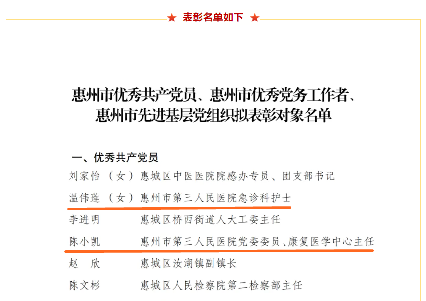 陳小凱和溫偉蓮?fù)精@得“惠州市優(yōu)秀共產(chǎn)黨員”的榮譽,不僅是對他們個人的肯定,更是對惠州三院黨員隊伍的鼓勵和鞭策。