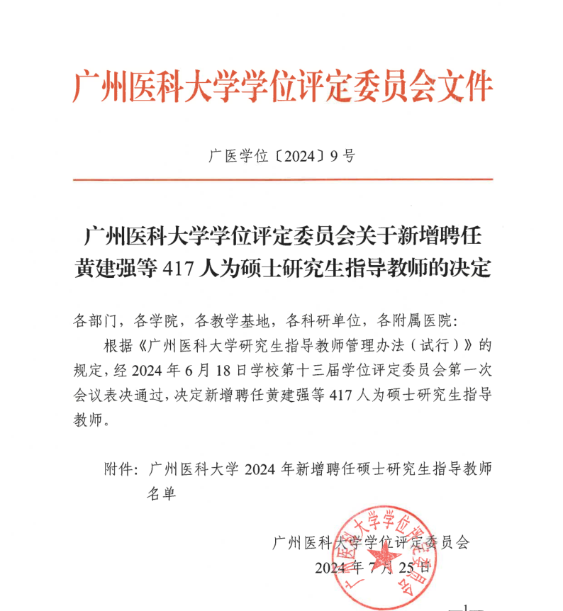近日,經(jīng)廣州醫(yī)科大學(xué)學(xué)位評(píng)定委員會(huì)評(píng)審,正式公布《廣州醫(yī)科大學(xué)2024年新增聘任博士研究生指導(dǎo)教師名單》、《廣州醫(yī)科大學(xué)2024年新增聘任碩士研究生指導(dǎo)教師名單》。此次導(dǎo)師遴選,廣州醫(yī)科大學(xué)附屬惠州醫(yī)院(惠州市第三人民醫(yī)院)新增專業(yè)型博導(dǎo)1名,專業(yè)型碩導(dǎo)3名。
