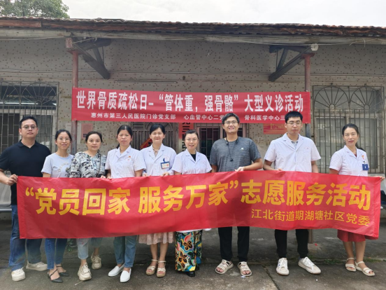 10月20日是世界骨質(zhì)疏松日。當(dāng)日上午,為提高居民對(duì)骨質(zhì)疏松癥的認(rèn)識(shí)水平,惠州市第三人民醫(yī)院門(mén)診黨支部、骨科醫(yī)學(xué)中心三黨支部、心血管醫(yī)學(xué)中心二黨支部的黨員醫(yī)護(hù)人員來(lái)到期湖塘社區(qū)衛(wèi)國(guó)苑,開(kāi)展了以“管體重,強(qiáng)骨骼”為主題的大型義診活動(dòng)。