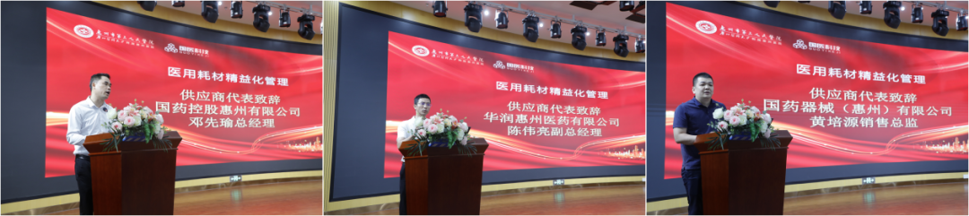 國(guó)藥控股惠州有限公司總經(jīng)理鄧先瑜、華潤(rùn)惠州醫(yī)藥有限公司副總經(jīng)理陳偉亮以及國(guó)藥器械(惠州)有限公司銷售總監(jiān)黃培源等供應(yīng)商代表分別致辭。他們紛紛表示,將全力支持SPD項(xiàng)目的建設(shè)與實(shí)施。