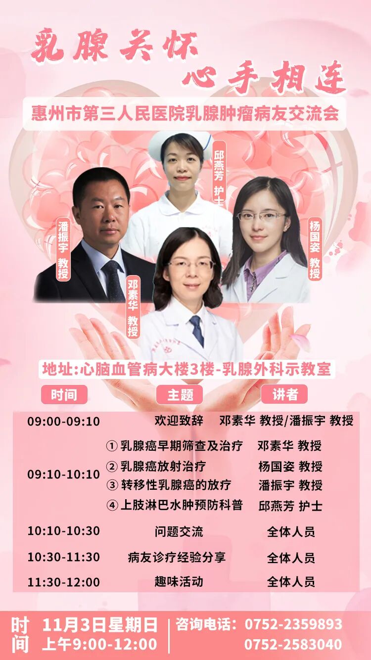 【活動預告】11月3日惠州三院乳腺腫瘤病友交流會,誠邀乳腺腫瘤病友及感興趣的女士參與