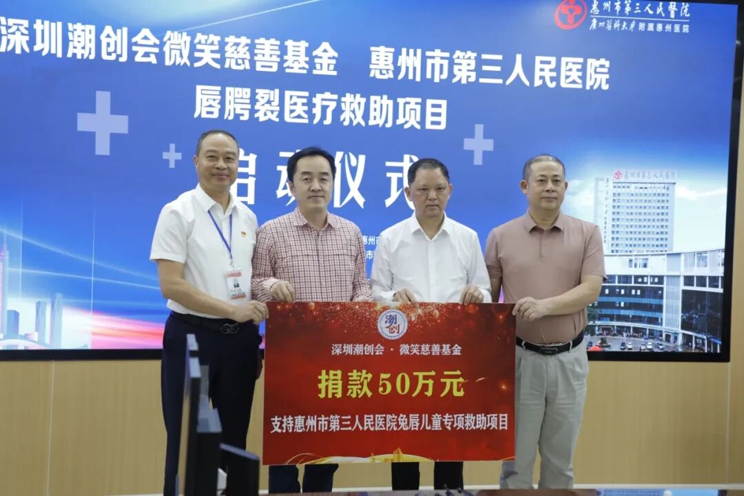 會上,蔡文川會長代表深圳潮創(chuàng)會、微笑慈善基金會向惠州市第三人民醫(yī)院捐贈了50萬元人民幣,設立專項救助基金,用于唇腭裂兒童患者的治療和救助。