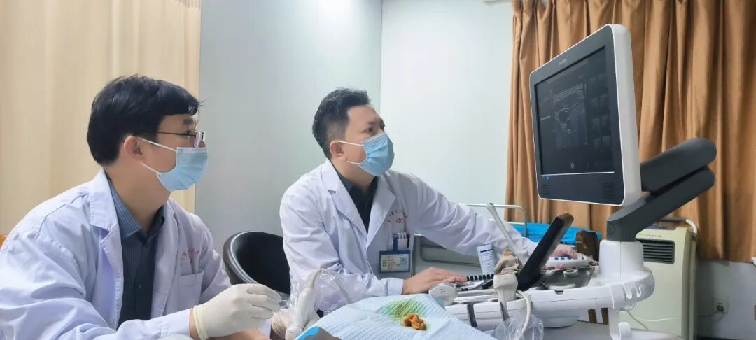 甲狀腺外科蔣富兵主任醫(yī)師(左一)及超聲介入科黃劍毅主任醫(yī)師(右一)在為患者穿刺