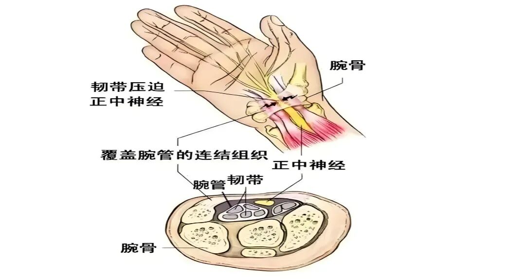 是一種常見的周圍神經(jīng)卡壓性疾病,主要由正中神經(jīng)在腕管內(nèi)受壓引起的。腕管是一個位于手腕掌側(cè)的骨性纖維隧道,由腕骨和腕橫韌帶構(gòu)成,正中神經(jīng)和多條肌腱從中通過,我們可以把腕管當(dāng)成一個“隧道”,里面有正中神經(jīng)和肌腱通過,而正中神經(jīng)控制著大拇指、食指、中指和部分無名指的感覺和運動,當(dāng)“隧道”變小,或者里面東西增多的時候,就會壓迫正中神經(jīng)導(dǎo)致功能異常,引起麻木、疼痛、無力等手部問題。
