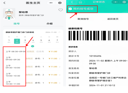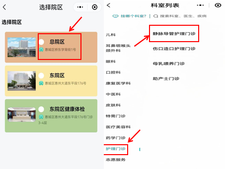 第二步 點(diǎn)擊公眾號菜單欄中的就醫(yī)服務(wù)→預(yù)約掛號→總院區(qū)→護(hù)理門診→靜脈導(dǎo)管護(hù)理門診→選擇就診時間。