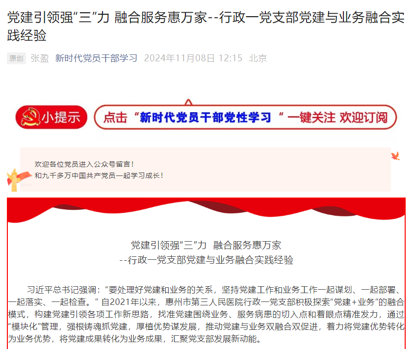 近日,惠州市第三人民醫(yī)院黨委辦公室張盈同志的黨建經(jīng)驗(yàn)類文章《黨建引領(lǐng)強(qiáng)“三”力,融合服務(wù)惠萬(wàn)家—行政一黨支部黨建與業(yè)務(wù)融合實(shí)踐經(jīng)驗(yàn)》被《新時(shí)代黨員干部學(xué)習(xí)》公眾號(hào)刊載。本次刊載不僅是對(duì)筆者個(gè)人作品的認(rèn)可,更是對(duì)惠州三院行政一黨支部對(duì)內(nèi)上傳下達(dá),確保政令暢通;對(duì)外便民惠民,創(chuàng)新服務(wù)模式的充分肯定,樹(shù)立了基層黨支部黨建與業(yè)務(wù)融合工作領(lǐng)域的新標(biāo)桿。
